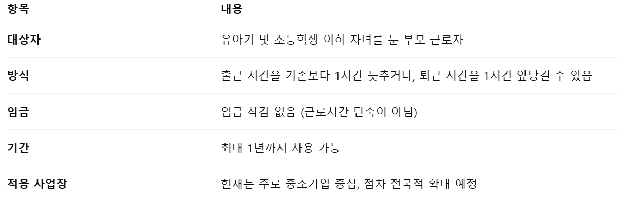 - 임금 삭감 없이 출근 시간을 1시간 늦추거나 퇴근을 앞당길 수 있음