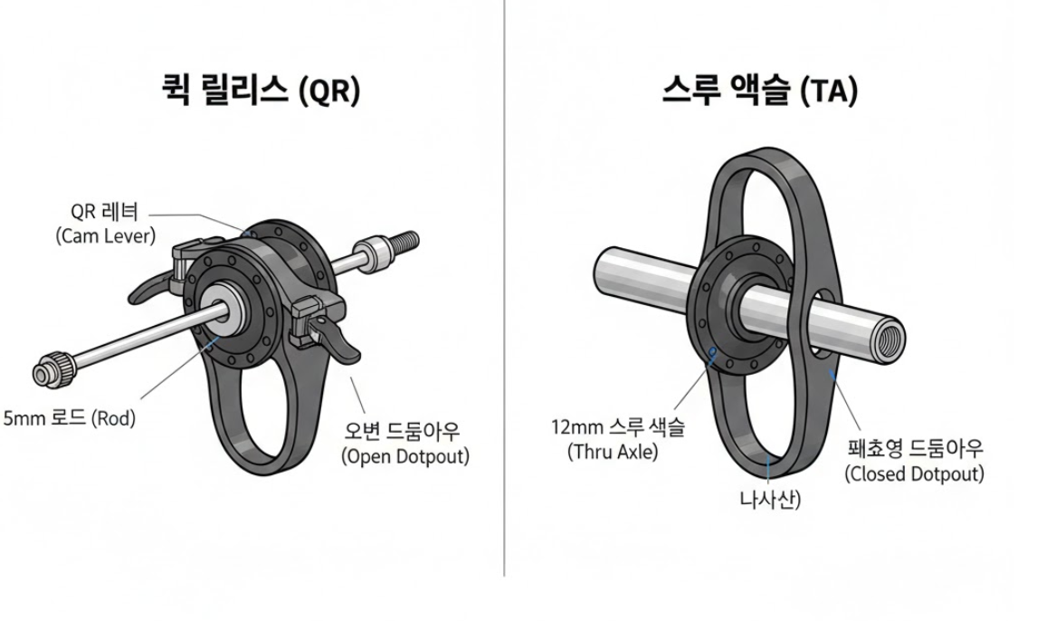 | 구분 | 퀵 릴리스 (QR) | 스루 액슬 (TA) |