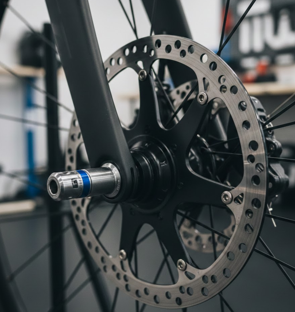 - 일관된 장착 위치: QR 방식은 휠을 끼울 때마다 미세하게 위치가 달라질 수 있습니다. 이 미세한 차이로 인해 브레이크 로터가 패드에 닿아 '스윽스윽' 소음이 발생하는 '칼갈이' 현상이 생기곤 하죠.